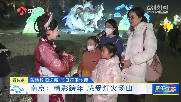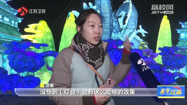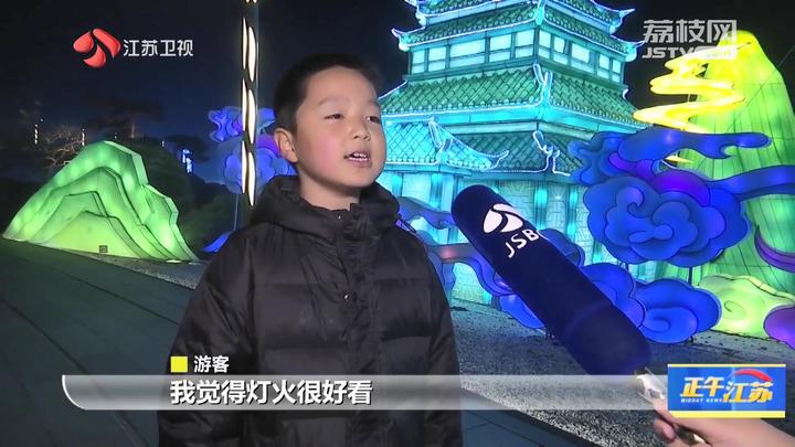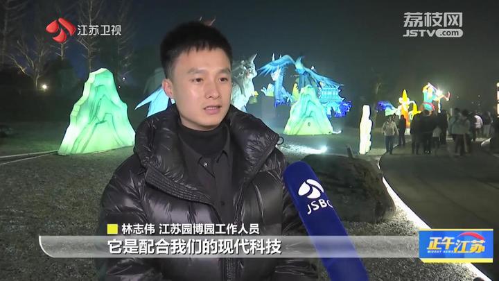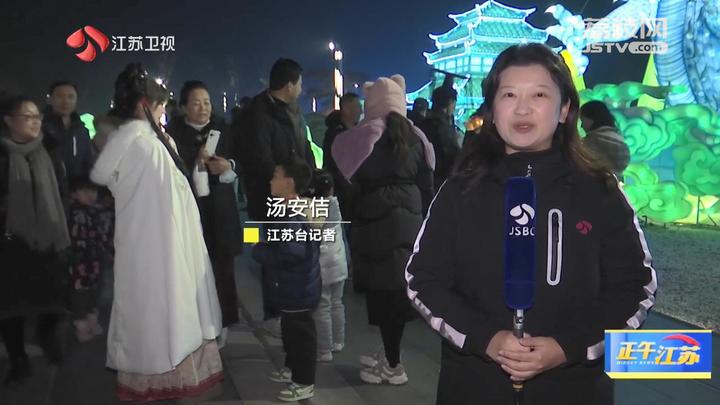 江苏台记者汤安佶:“今天是元旦假期的第一天,江苏园博园灯火阑珊。这个假期,大型沉浸式国潮灯会也在这里正式和大家亮相。同时在现场,我们也看到景区工作人员身着汉服的跟小朋友、跟游客进行互动。”