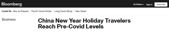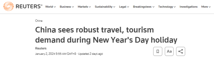 彭博社刊文称,中国的主要假期通常是全球旅行最繁忙的时期之一,在二月份农历新年假期之前,中国旅游业的复苏是一个可喜的迹象。强劲的元旦旅游市场激发了人们对旅游业复苏以提振经济的希望。