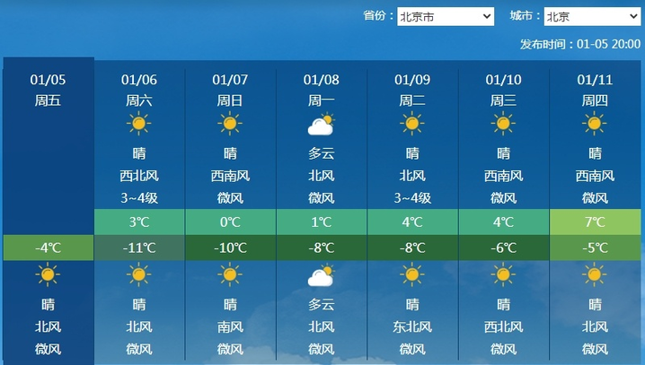 华北地区周末也会迎来较为明显的降温。周日时,北京、天津、太原最高气温都只有0℃。而且北京还将伴随着强劲的北风,风寒效应十分显著。