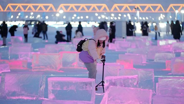 游客在哈尔滨松花江冰雪嘉年华景区的“冰光秀场”游玩、拍照(1月3日摄)。 新华社 图
