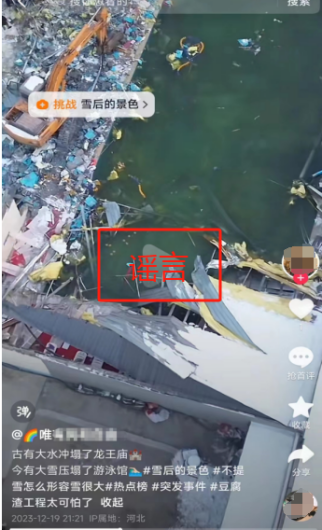 12月21日,竞秀网警工作中发现,抖音用户“唯某某”,在抖音发布了一条视频称:“古有大水冲了龙王庙,今有大雪压塌了游泳馆,豆腐渣工程太可怕了。”该视频信息被多次转发,引发热议。竞秀公安分局对此非常重视,立即进行展开核查。经核实,该游泳池为正常工程改造,并非被雪压塌。此网络短视频明显系蹭热点编造谣言。