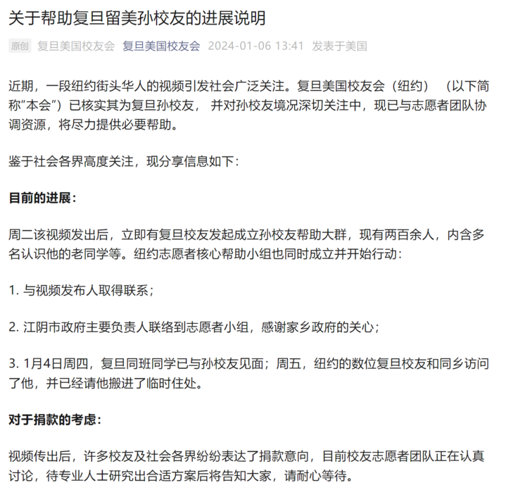 1月6日13:41,“复旦美国校友会”微信公众号发布《关于帮助复旦留美孙校友的进展说明》(以下简称《说明》)。其中提到,周二视频发出后,立即有复旦校友发起成立孙校友帮助大群,现有两百余人,内含多名认识他的老同学等。纽约志愿者核心帮助小组也同时成立并开始行动: