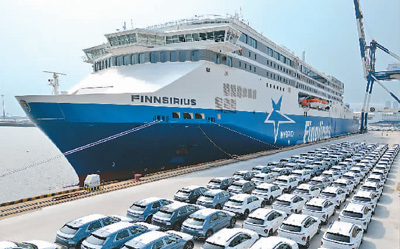 2023年7月25日,油电混合动力高端客滚船“Finnsirius”号在山东港口烟台港装载商品车。 |