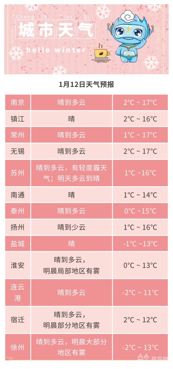 1月12日20时到1月13日20时全省晴到多云。最高温度:沿淮和淮北地区13~14℃,沿江和苏南地区17℃左右,其他地区15~16℃;最低温度:淮北地区0~-1℃,其他地区1℃左右。全省东南风4级左右。