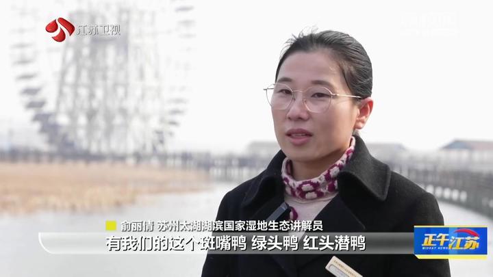 苏州太湖湖滨国家湿地生态讲解员俞丽倩介绍,湖面上黑压压一片的水鸟就是白骨顶,也有很多的雁鸭,还有斑嘴鸭、绿头鸭、红头潜鸭在湖面上。
