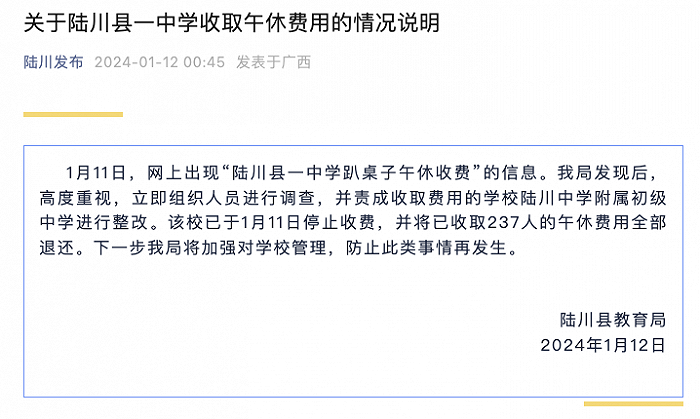 荔枝新闻讯 据“陆川发布”公众号消息,1月12日,广西陆川县教育局通报关于一中学收取午休费用的情况说明:1月11日,网上出现“陆川县一中学趴桌子午休收费”的信息,教育局立即组织人员进行调查,并责成收取费用的学校陆川中学附属初级中学进行整改。该校已于1月11日停止收费,并将已收取237人的午休费用全部退还。下一步将加强对学校管理,防止此类事情再发生。