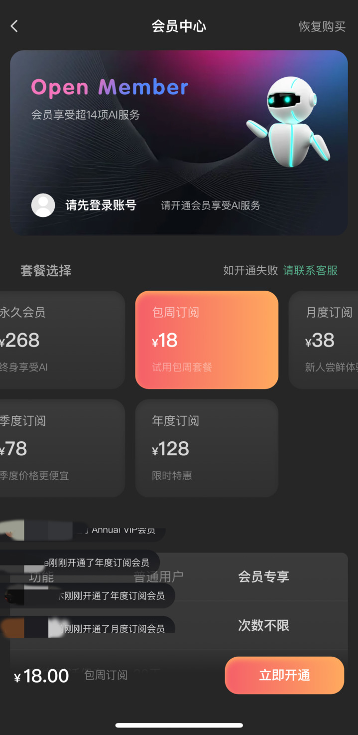 除了免密支付以外,还有不少消费者因自动续费,不知不觉被扣款。前不久,李女士出于好奇,下载了一款聊天机器人软件。“会员中心的套餐选择除了永久会员外,还有18元的包周订阅、38元的月度订阅、78元的季度订阅和128元的年度订阅,都没提‘连续XX’。”李女士以为,包周订阅就是只订一周,于是打算先体验一下。结果,第二周她再次被扣款18元。“原来套餐里没有一个是单独的,都是默认续订。”仔细查看后她恍然发现,“会员特权”下面用不起眼的灰色小字附上了“服务说明”,其中提到,“到期前24小时内会扣费并顺延至下一周期。”
