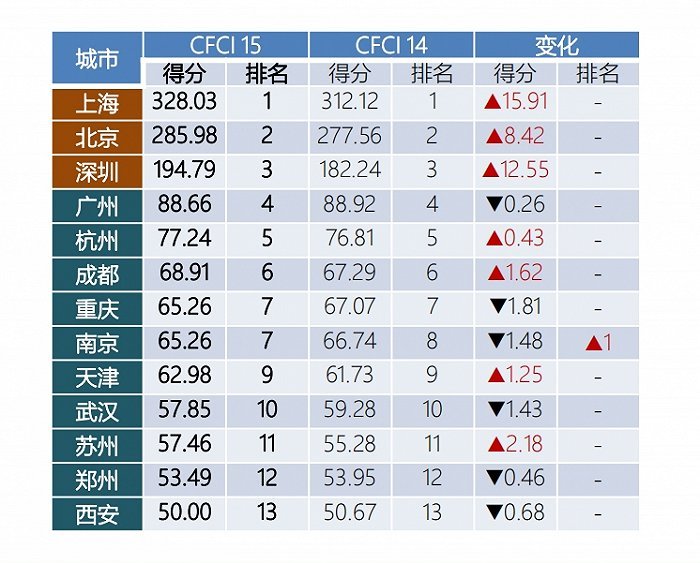 “第15期中国金融中心指数”显示,内地排名领先的金融中心竞争格局相对稳定,综合得分保持增长态势。其中,上海、北京、深圳位列全国金融中心综合竞争力榜单前三,区域金融中心前十强为广州、杭州、成都、重庆、南京、天津、武汉、苏州、郑州和西安。