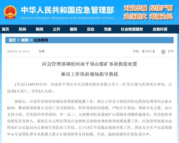 1月12日14时55分许,河南省平顶山市天安煤业股份有限公司十二矿发生煤与瓦斯突出事故,已造成8人死亡、仍有8人失联。