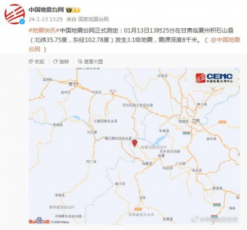 中国地震台网正式测定:01月13日13时25分在甘肃临夏州积石山县(北纬35.75度,东经102.78度)发生3.1级地震,震源深度8千米。