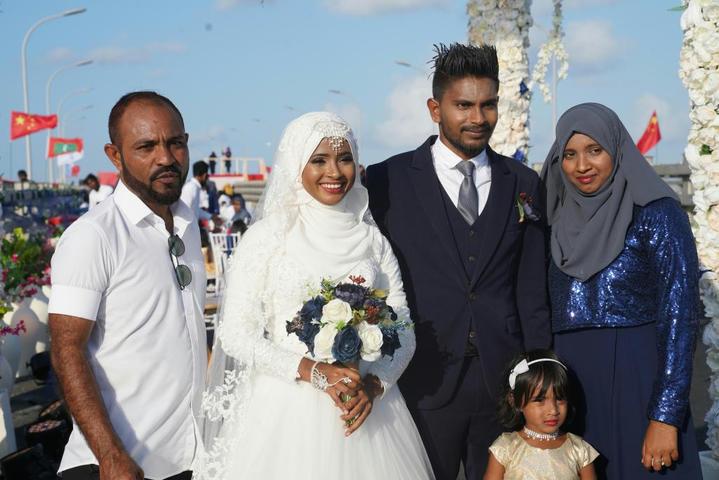 2018年8月31日,在刚刚正式通车的中马友谊大桥上,一对马尔代夫新婚夫妇与家人合影。