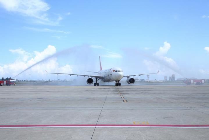 2023年1月18日,中国首都航空JD455航班在马尔代夫马累维拉纳国际机场接受水门礼。