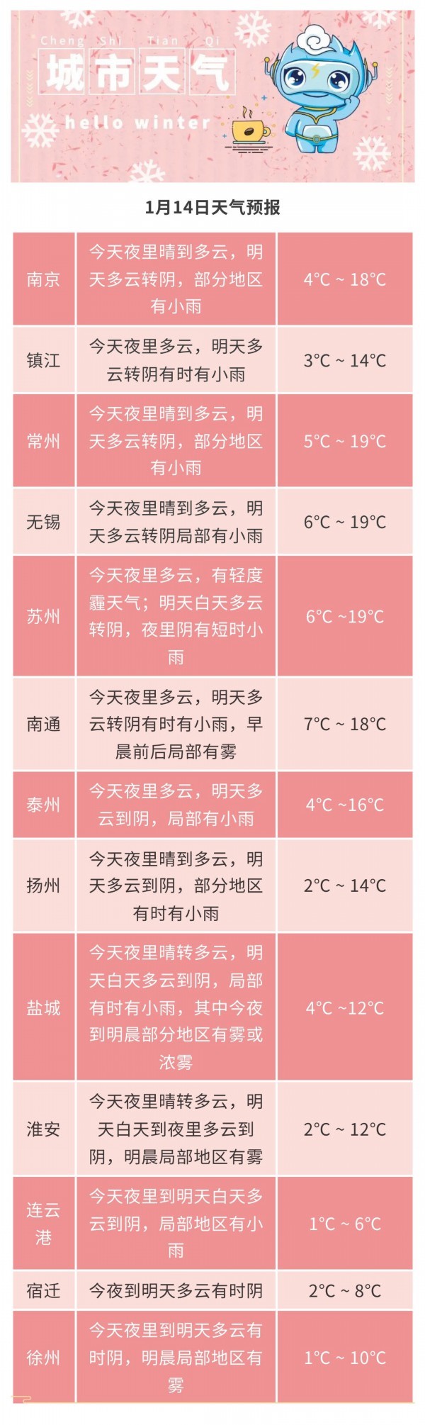 沿江和苏南地区多云转阴有时有小雨并渐止转多云,其他地区多云到阴。最高温度:沿淮和淮北地区7~8℃,沿江和苏南地区17~18℃,其他地区13℃左右;最低温度:沿淮和淮北地区-5~-6℃,有冰冻,本省东南部地区2℃左右,其他地区-2℃左右。全省偏北风4-5级阵风6级。