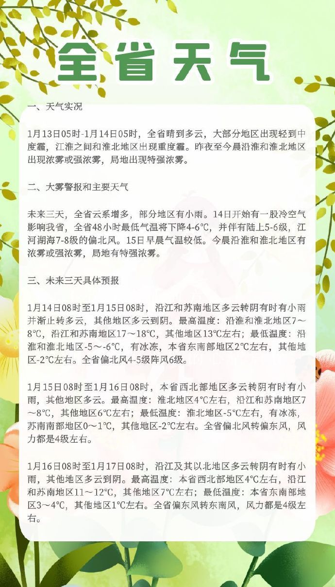 苏南地区阴有小雨并渐止转多云,其他地区阴转多云。最高温度:淮北地区4℃左右,沿江和苏南地区7~8℃,其他地区6℃左右;最低温度:沿淮和淮北地区-5~-6℃,有冰冻,本省东南部地区2℃左右,其他地区-2℃左右。全省偏北风4-5级阵风6级转偏东风3-4级。