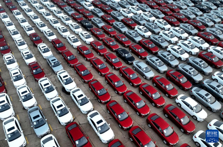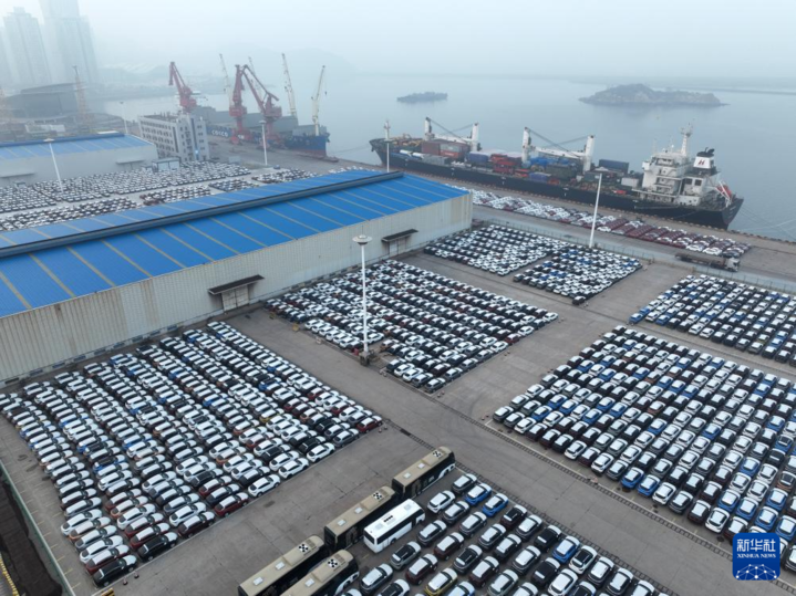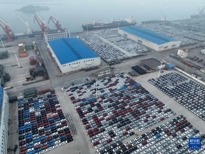 1月13日,在江苏连云港港东方港务分公司码头,大批汽车集港准备装船(无人机照片)。