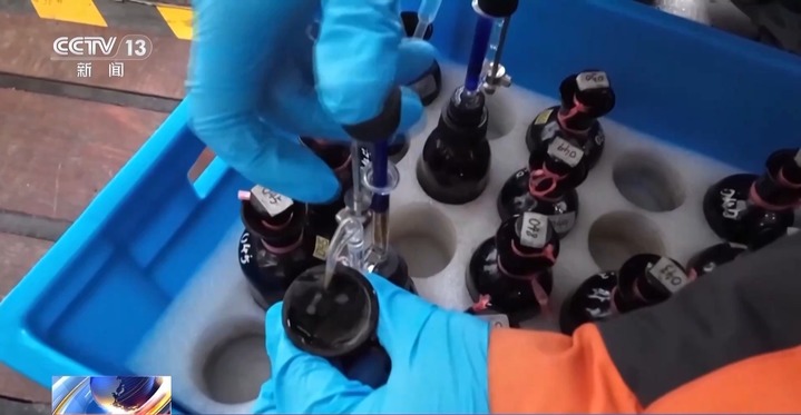 考察队员告诉记者,采集的海水样品,被用于满足不同考察项目的研究需求。做生物研究的队员会分析样品中肉眼不可见的微小浮游生物,而做化学研究的队员会在水样中加入试剂,分析其中的有机物和无机物含量。