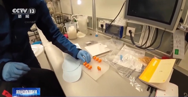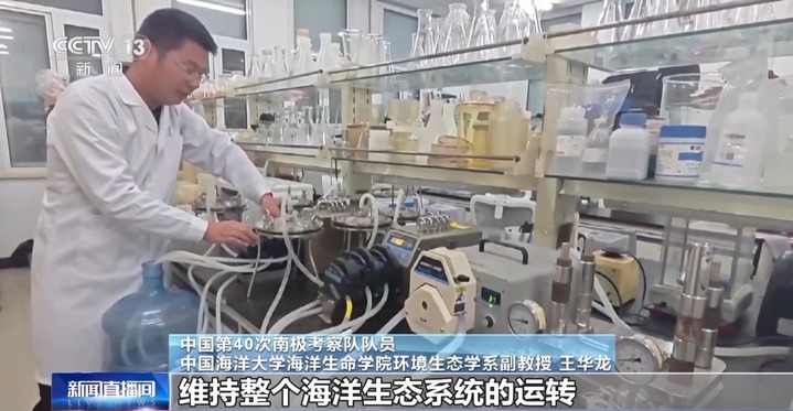 中国第40次南极考察队队员 王华龙:我们在南极进行海洋病毒的收集工作也是很有挑战的。首先我们会通过多次取样,收集150升的海水。通过10个小时的过滤、浓缩,我们会将其收集到一个只有50毫升的小管里面,最后带回(国内)实验室,进行海洋病毒的后续研究工作。