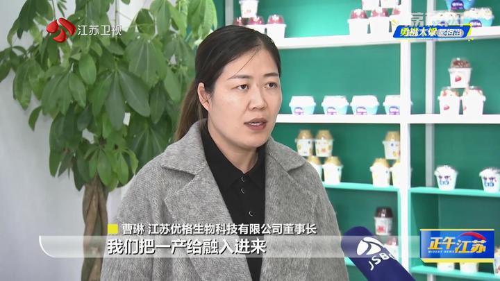 江苏优格生物科技有限公司董事长曹琳说:“我们把一产给融入进来,下游产品所用的杯子、膜、勺子,我们全部都融入拧成一股绳,成为集研发、销售、服务、加工为一体的酸奶全产业链,市场份额预计可以达到50%。”