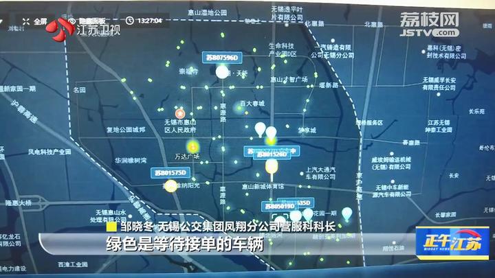 无锡公交集团凤翔分公司营服科科长邹晓冬说:“目前我们在12平方公里的范围之内,蓝色是已经接单的车辆、绿色是等待接单的车辆、黄色是正在休息的车辆。这些绿色的小点是站点,乘客在任何一个站点都能叫到车。”