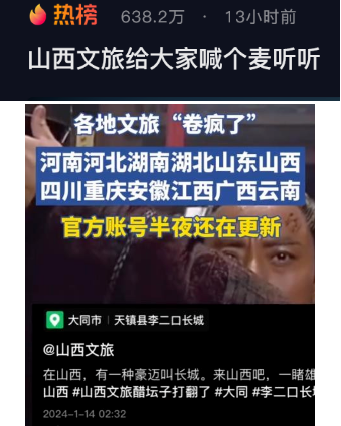 无独有偶,像贵州这样“听劝”的文旅局不在少数:沈阳文旅局长对网友的建议“全部采纳”;吉林文旅的官方账号因被指“名字太隐蔽”而火速改名;河南河北山东山西文旅“题海战术”日更几十条抖音“晒家底”,被网友笑称“这四省上一次这么热闹还是春秋战国时期”……可以想见,社交媒体已经成为推动地方旅游发展的重要力量,这些城市的爆火大多得益于互联网的口碑传播效应。