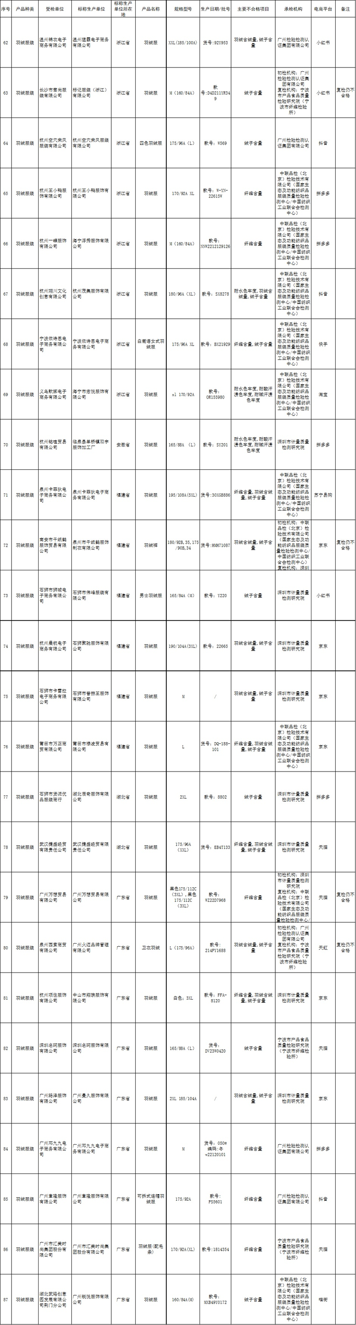 11批次产品羽绒含绒量不合格