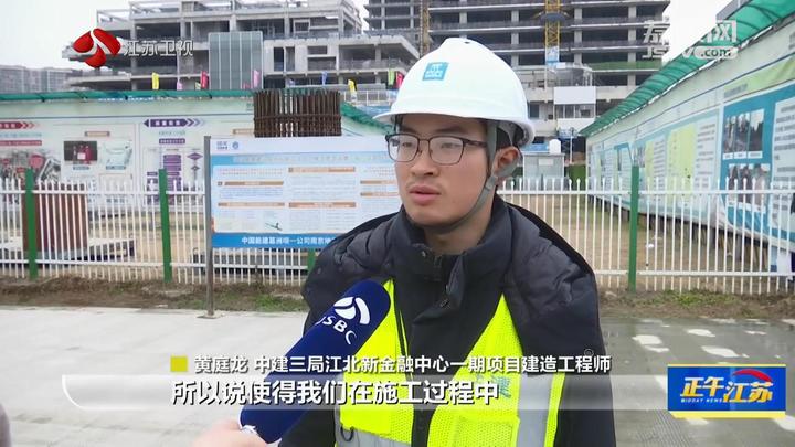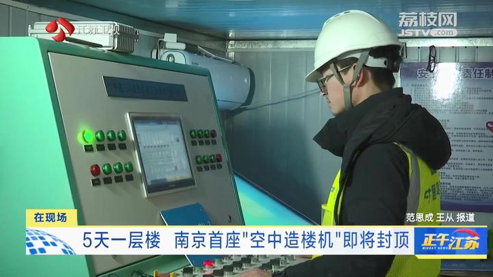 江苏台记者范思成:“我现在来到的是南京江北新金融中心一幢31层在建高楼的顶部。这里被蓝色方形防护网包裹着,里面就是的‘空中造楼机’,是融合了安防、堆场、养护系统的全封闭式操作空间。这里面通过构建连接、智能平台,可以实现一键自动抬升。我们虽身处百米高空,但宽敞稳固的平台仍给人带来如履平地的安全感。”
