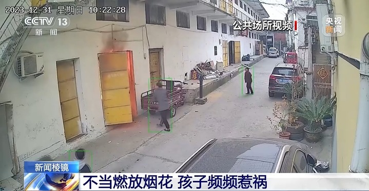 今年1月1日,湖南长沙县一小区的公共场所视频记录下这样一幕。下午3时58分,两个孩子在停放了多辆电动车的一楼架空层燃放手持烟花。黄衣男孩从玩伴手中接过烟花后,径直走到架空层的围挡旁,用四溅的烟花点燃了围挡上的绿色材料。