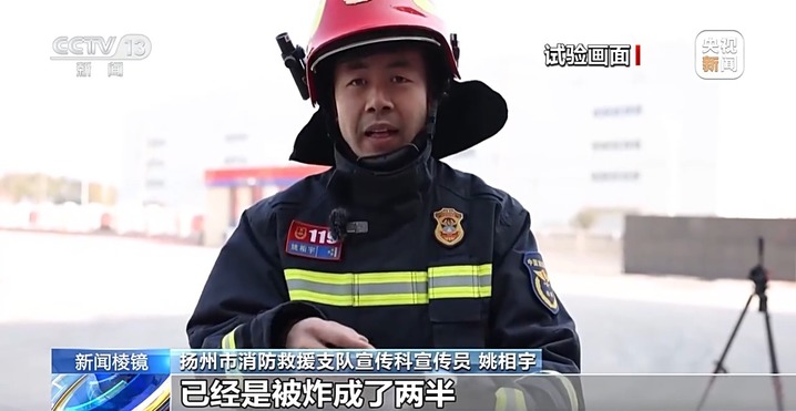 扬州市消防救援支队宣传科宣传员 姚相宇:这个鞭炮放在里面之后,把它炸飞,高到已经比我们这个营房的楼还要高,而且我们看到这一个金属制的碗,已经是被炸成了两半。