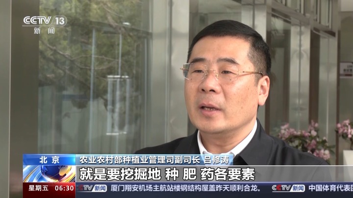 农业农村部种植业管理司副司长 吕修涛:就是要挖掘地种肥药各要素、耕种管收各环节的增产潜力,加快把先进适用的高质高效品种技术由点及线到面推广开来,促进全要素补齐短板、全环节融合打造、全领域推动提升,千方百计将科技潜力转化为现实产量、专家产量转化为农民产量、典型产量转化为大田产量,辐射带动大面积均衡增产。