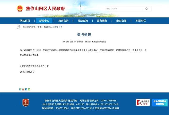 据河南焦作市山阳区人民政府官网发布的通报,1月19日21时许,东方红广场发生一起因烟花爆竹燃放操作不当引发的意外事故,三名燃放者受伤,已及时送医救治,无生命危险。后续工作正在妥善处置。