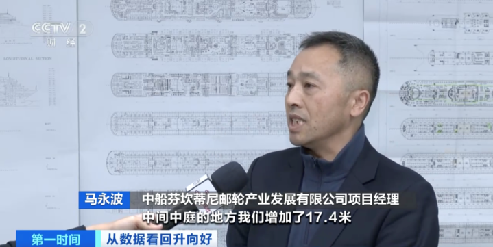 中船芬坎蒂尼邮轮产业发展有限公司项目经理 马永波:中间中庭的地方我们增加了17.4米,把船拉长了,公共区域包括餐厅,整个二号船公共区域的面积,要比一号船增加了3000平方米左右,整个详细设计的进度完成了大概80%。