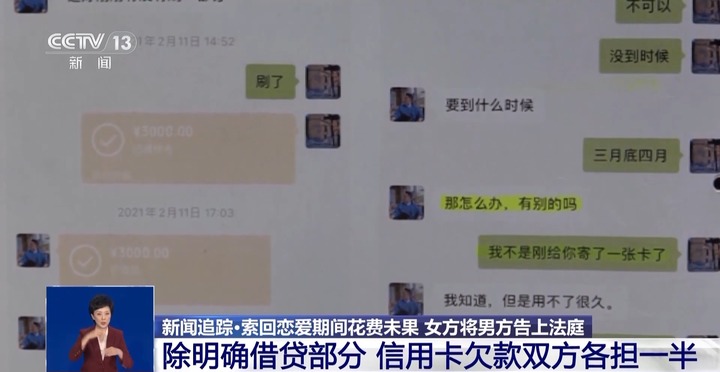 厦门市湖里区人民法院民事审判二庭法官 孔晨:法院在审理过程中、查明事实的过程中,发现女方也确实存在使用信用卡的可能,女方也没有对此进行一个充分的举证,在双方都没有办法举证,也可以说我们是根据证据优势规则来认定之后双方各自负担一半是符合公平原则的,也倡导一种男女恋爱之间真诚平等相处的价值导向。