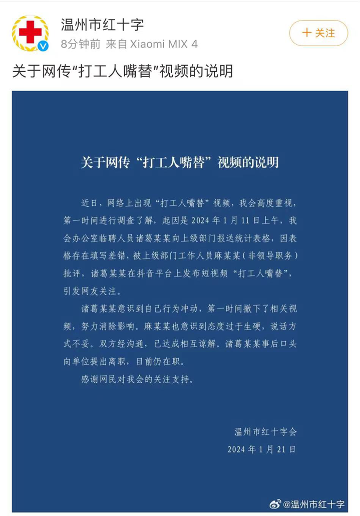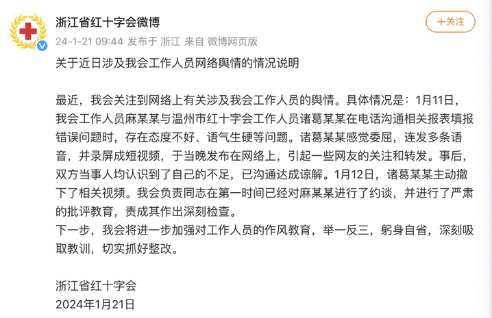 针对此事,浙江省红十字会微博发布情况说明称,该会工作人员麻某某与温州市红十字会工作人员诸葛某某在电话沟通相关报表填报错误问题时,存在态度不好、语气生硬等问题。诸葛某某感觉委屈,连发多条语音,并录屏成短视频,于当晚发布在网络上,引起一些网友的关注和转发。事后,双方当事人均认识到了自己的不足,已沟通达成谅解。目前诸葛某某主动撤下了相关视频。该会已对麻某某进行了约谈,责成其作出深刻检查。