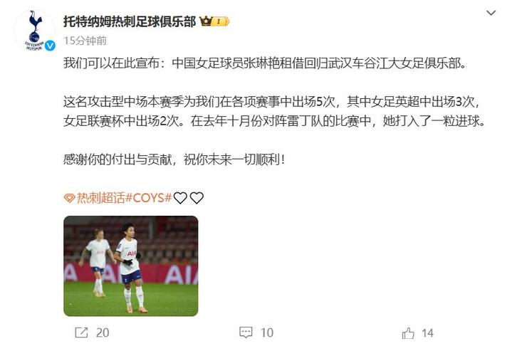 去年9月,中国女足国脚张琳艳租借加盟热刺女足。张琳艳2022年7月租借加盟苏黎世草蜢足球俱乐部,2023年8月回归武汉车谷江大女足俱乐部。2023年9月,张琳艳第二次留洋,租借加盟热刺女足。