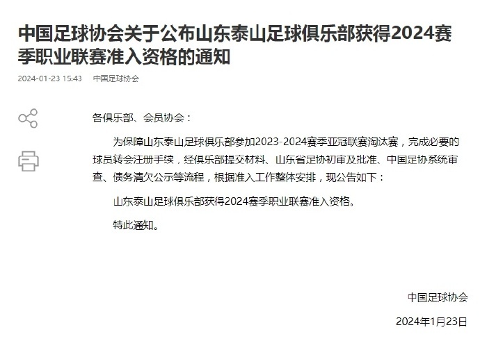 荔枝新闻讯 1月23日下午,中国足协发布公告,为保障山东泰山足球俱乐部参加2023-2024赛季亚冠联赛淘汰赛,完成必要的球员转会注册手续,经俱乐部提交材料、山东省足协初审及批准、中国足协系统审查、债务清欠公示等流程,根据准入工作整体安排,山东泰山足球俱乐部获得2024赛季职业联赛准入资格。