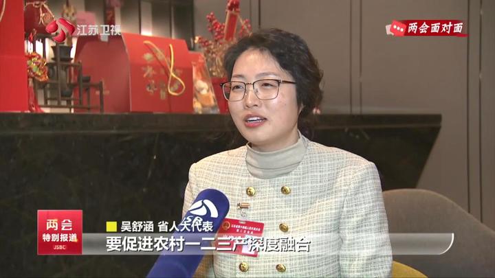 江苏台记者尹美又:“新农人,新愿景。吴晓波代表带着热腾腾的思考来到会上。她还主动约了几位‘新农人’伙伴,一起围绕更加扎实地推进农业现代化出谋划策。”