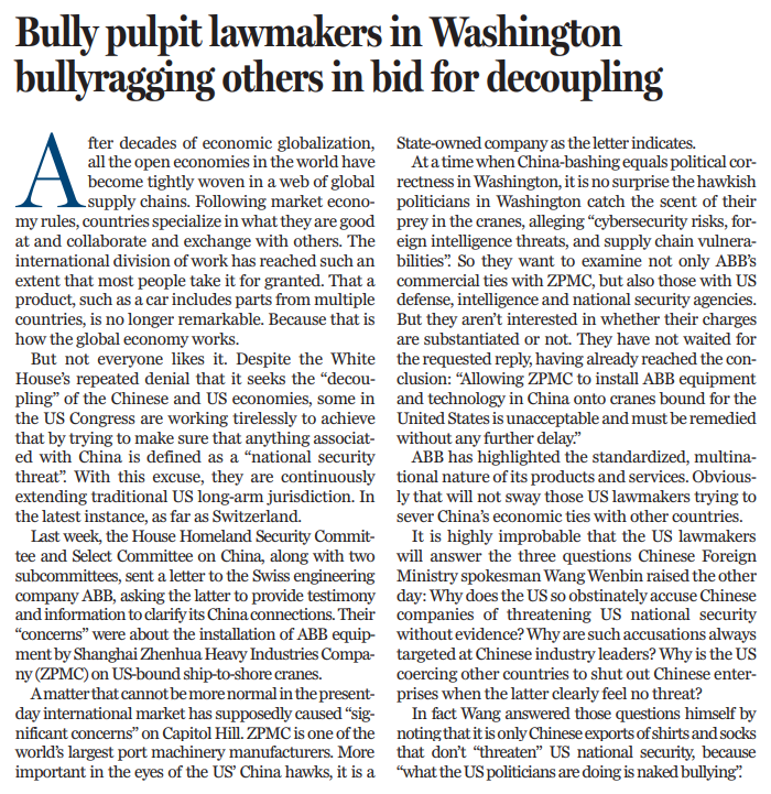 上周,美国众议院国土安全委员会和中美战略竞争特别委员会致信瑞士机械工程公司ABB集团,要求该集团提供相关证明,以澄清其与中国的关系。美方“关切”的问题,涉及上海振华重工在向美国出口的岸边集装箱起重机上安装ABB设备一事。