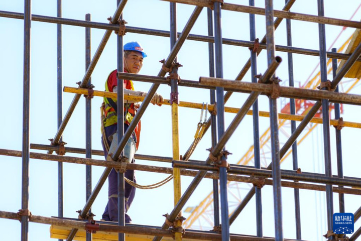 工人在乌兹别克斯坦首都塔什干的奥林匹克城项目工地工作(2023年8月13日摄)。 新华社发(扎法尔摄)