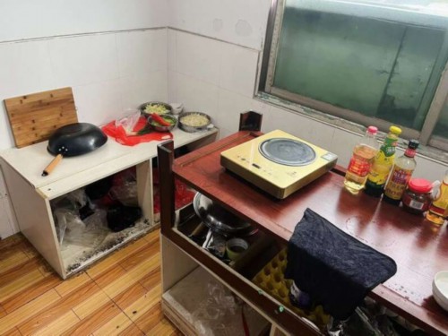 何求杰租住的出租屋厨房一角,放着已经离世的同学备的菜。受访者供图
