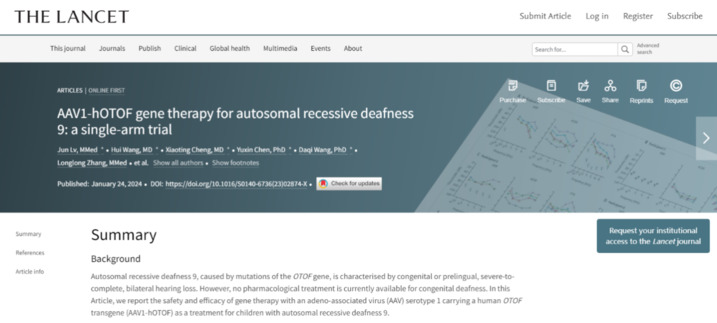 1月25日,记者从复旦大学附属眼耳鼻喉科医院获悉,该院领衔在遗传性耳聋基因治疗方面取得重大突破,全球首次利用研发的基因治疗药物恢复遗传性耳聋患者听力和言语,该临床研究结果以长文形式于2024年1月25日发表在全球顶级医学期刊《柳叶刀》正刊(The Lancet,影响因子:169),论文题目为“AAV1-hOTOF Gene Therapy for Autosomal Recessive Deafness 9: a single-arm trial”(AAV1-hOTOF基因治疗常染色体隐性遗传性耳聋9:一项单臂研究)。