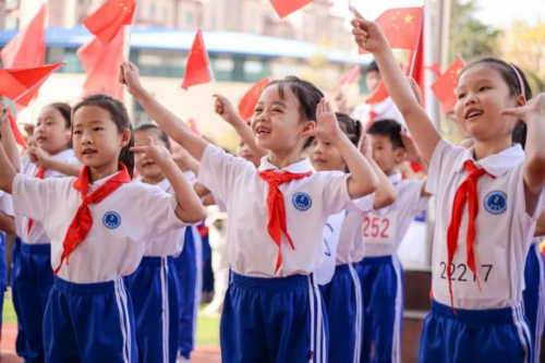 2023年10月12日,在山东省青岛市城阳区第二实验小学,学生们在秋季运动会开幕式上进行才艺展演。通讯员 张鹰 摄