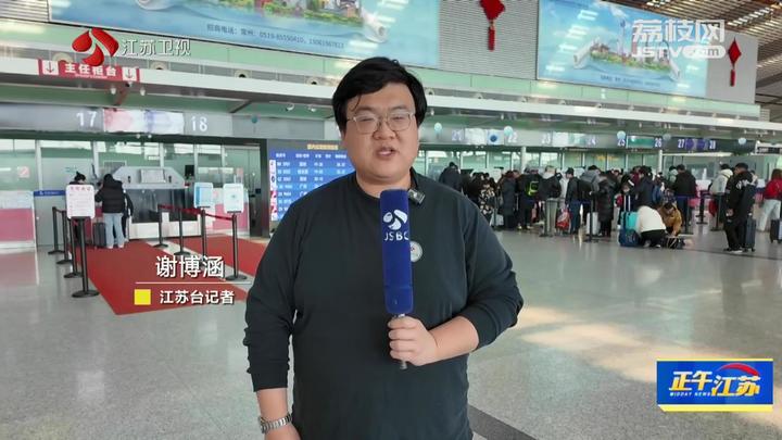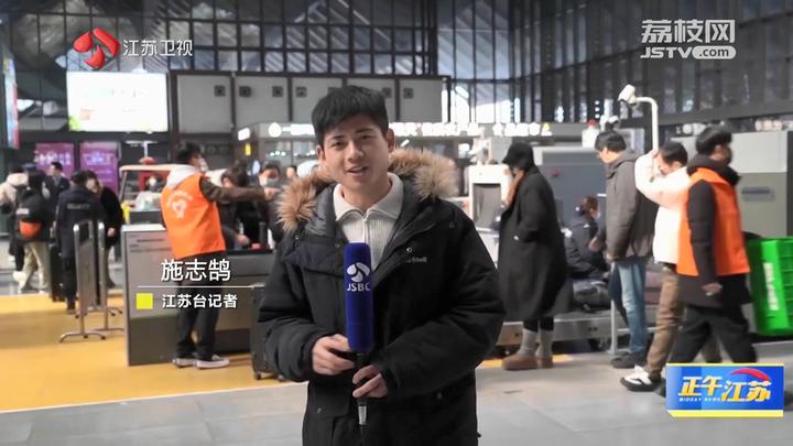 江苏台记者施志鹄报道:“我现在是在苏州火车站的候车大厅,今天是春运首日,大家可以看到我身后已经是人头攒动,不少人提着行李等待入站。”