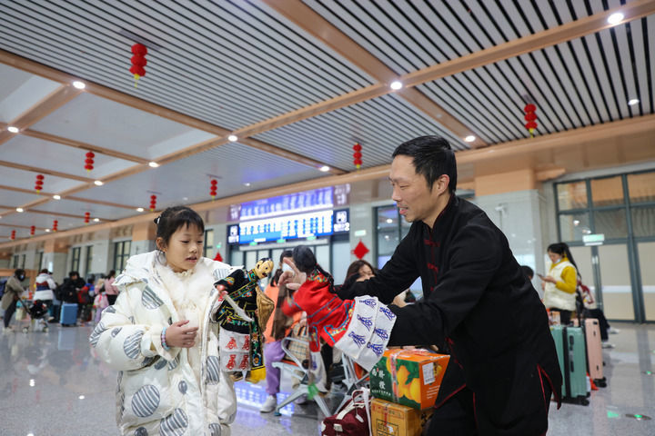 2024年1月26日,布袋木偶戏表演人员在福厦高铁泉州南站候车室与小朋友互动。新华社记者 周义 摄