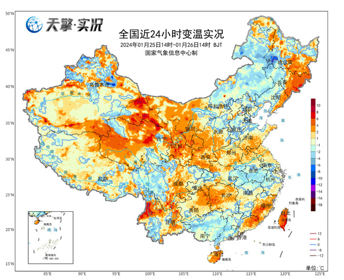 今天白天,回暖的脚步并没有停止。14时变温实况图上,自北到南呈现“降升交错”的分布,升温和降温幅度不大,普遍在4℃以内。