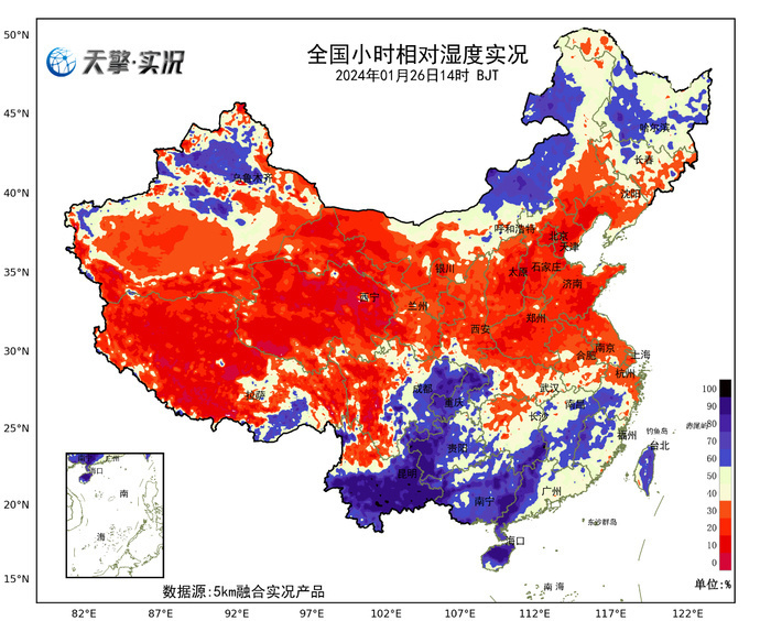 气温的回升伴随着干燥的天气,今天中东部降水稀少,北方到长江中下游一带,以晴或多云天气为主,午后相对湿度普遍不足30%,天气干燥。至于阴雨天气,主要笼罩在云南、四川盆地、广西、广东、海南、湖南南部等地。