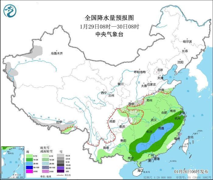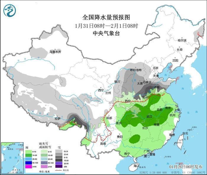 中央气象台预计,1月31日至2月3日,中东部地区将出现一次大范围雨雪天气过程;西北地区东部、华北、东北、黄淮等地有小到中雪,部分地区有大雪,江汉、江淮等地有雨夹雪,长江以南大部有中到大雨,局部有暴雨。