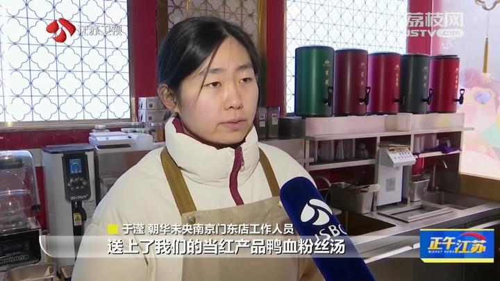 朝华未央南京门东店工作人员于滢告诉记者,特意在“温暖多一度”的福袋里面送上了当红产品鸭血粉丝汤,这样户外工作者几分钟时间就能喝上一碗热气腾腾的鸭血粉丝汤,温暖他们的胃,也温暖他们的心。