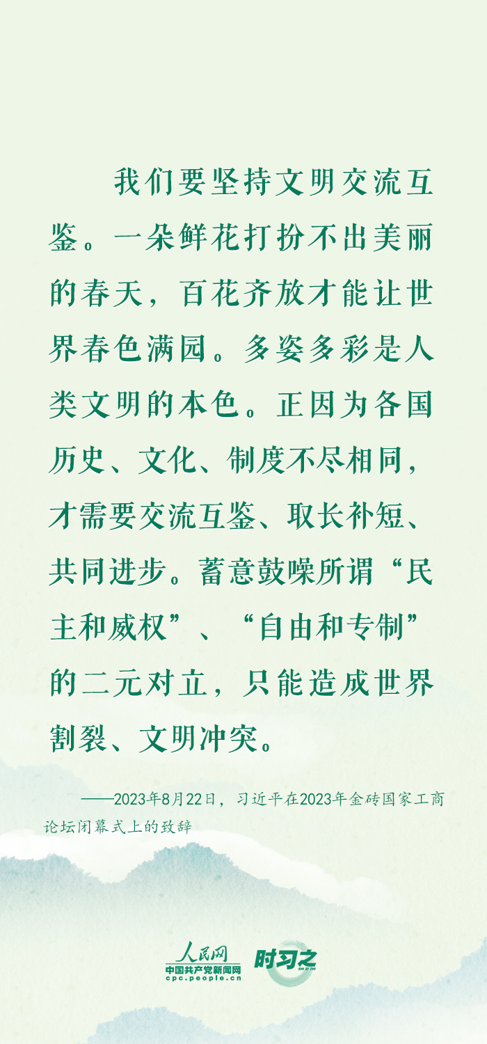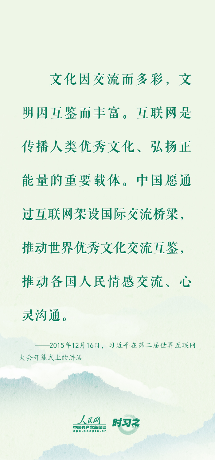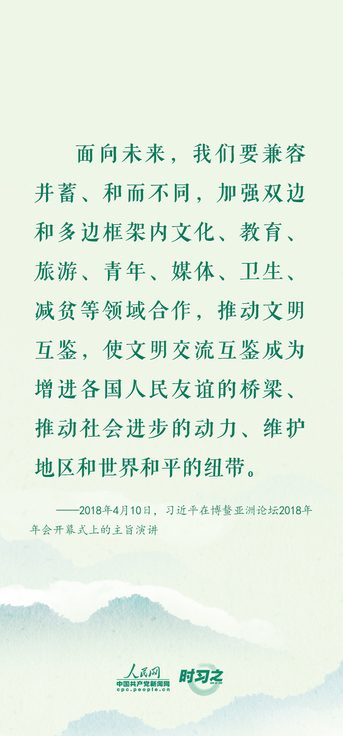 文化因交流而多彩,文明因互鉴而丰富。习近平在不同场合多次发表重要讲话,推动不同国家、不同民族、不同文化间加强交流互鉴,共同绘就美美与共的人类文明画卷。