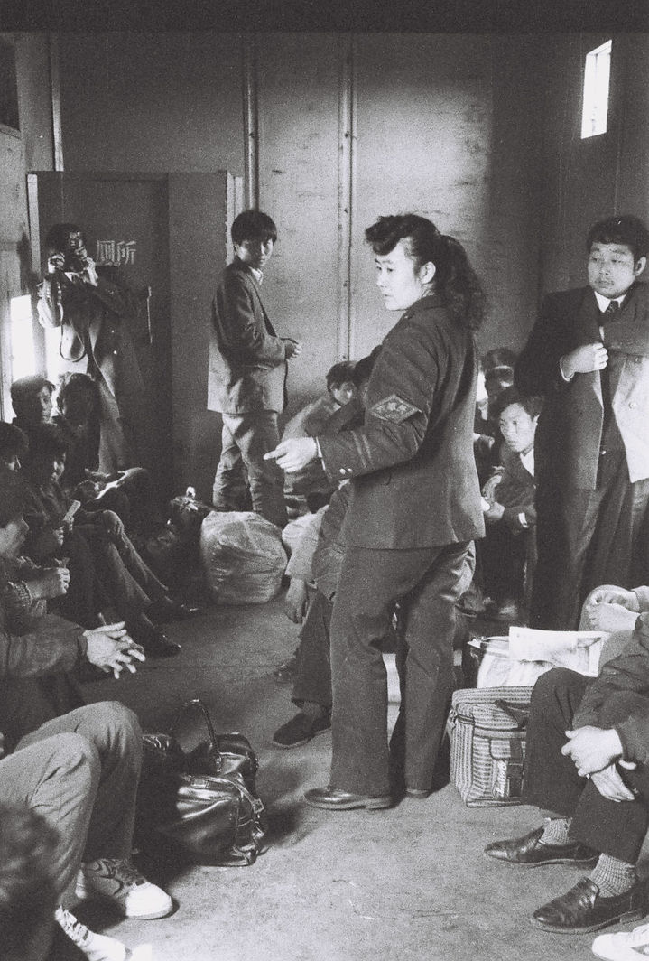 1994年春运期间,在济南铁路局“棚代客”列车上,乘务员在向乘客讲解临时搭建的简易厕所使用注意事项。 新华社发(傅振祥摄)