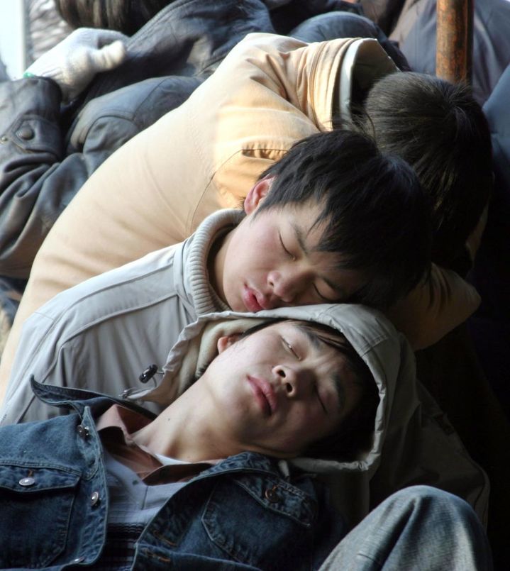 2005年1月17日,几名外来务工者在温州火车站临时售票处前休息,等待购买回家的火车票。新华社发卢春雨摄